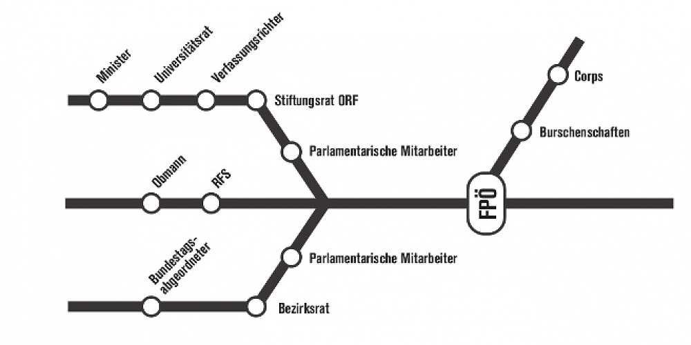 Zu voller Entfaltung gelangte das Korporierten-Jobkarussell allerdings unterhalb der Ministerebene: in den Ministerialkabinetten, den Aufsichtsräten teilstaatlicher Betriebe, den von der Regierung beschickten Universitätsräten, aber etwa auch am Verfassungsgerichtshof und im Stiftungsrat des staatlichen Rundfunks (ORF). Ähnliches war bereits während der ÖVP-FPÖ-Koalition ab 2000 zu beobachten gewesen. Auch damals waren deutschnationale Korporierte von der FPÖ an allerlei Schaltstellen der Republik nominiert worden — und konnten sich dort, qua Verbeamtung, teilweise bis heute halten. Besonders effektiv seilschaftete Martin Graf, der als Geschäftsführer der Austrian Research Centers Seibersdorf deren Gehaltsliste mit einem halben Dutzend Bundesbrüder seiner Burschenschaft Olympia füllte.