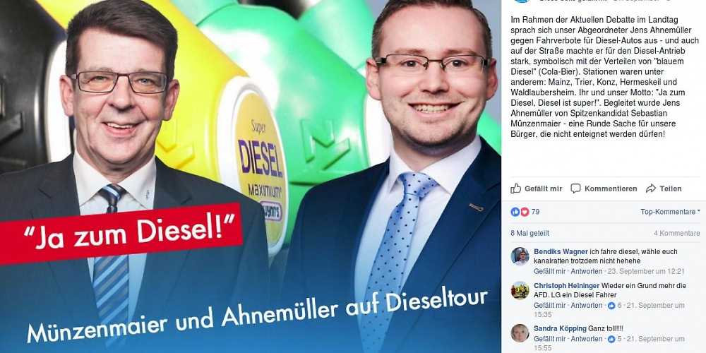 Mit überraschend hoher Zustimmung setzte sich Sebastian Münzenmaier im März 2017 im Wettbewerb um den Spitzenplatz zur Bundestagswahl durch. Der Plan der Parteispitze: Ein Konsenskandidat sollte die Flügel einen und den Landesverband geschlossen in die Bundestagswahl führen. Unklar ist, ob sämtlichen Beteiligten klar war, wen sie da ins Rennen geschickt hatten. Münzenmaier war dem Amtsgericht Mainz zufolge in der Nacht zum 18. März 2012 mit etwa 40 anderen Fußballfans aus dem Hooliganspektrum des 1. FC Kaiserslautern und des VfB Stuttgart an einem Angriff auf Anhänger*innen des FSV Mainz 05 beteiligt. Sie sollen den Mainzer Fans, die von einem Auswärtsspiel aus Augsburg zurückkehrten, aufgelauert haben. Das Amtsgericht Mainz verurteilte ihn daher zu einer Freiheitsstrafe von sechs Monaten auf Bewährung und einer Geldstrafe in Höhe von 10.000 Euro. Das Urteil ist noch nicht rechtskräftig, Münzenmaier kann noch Berufung einlegen.