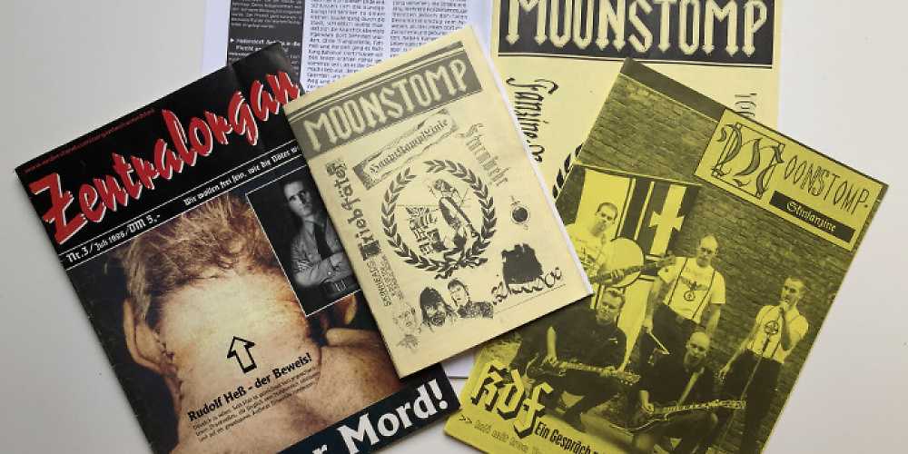Während die zweite Platte von SchuldSpruch „Im Namen Des Volkes!“ aus dem Jahr 2014 bei Street Justice Records gelistet wird und auch über neonazistische Versände wie OPOS Records und Das Zeughaus zu beziehen ist, erschien die 2019 veröffentlichte Maxi-Single „Schuld bist du!“ bei einem weiteren Label von Bernd Krick: German Oi! Records (G.OI.R). Das ist kein Zufall, da es bei dieser Produktion textlich eindeutiger wird, wenn etwa die extrem rechte Erzählung des „Großen Austausches“ besungen wird. Auf seinem Zweit-Label veröffentlicht Krick vor allem Bands, die politisch rechts bis extrem rechts zu verorten sind. Hier ist etwa die Band Prolligans (Allgäu) zu erwähnen, die zwei Releases auf German Oi! vorzuweisen hat. Die Prolligans sind neben Bombecks (Eisenach), Roials (Dresden) und Kotten aus Solingen (vgl. LOTTA #75, S. 34—35) auch auf dem „This is German Noise“-Sampler des Labels vertreten. Das Cover des Samplers zeigt sicher nicht zufällig eine Hand, welche den berühmten Volksempfänger hält — eines der wichtigsten Propagandainstrumente des Nationalsozialismus.