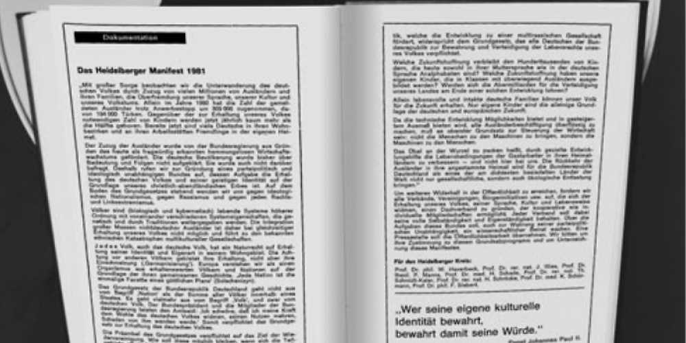Zudem rekurrierten die Unterzeichner in den ersten Worten des „Manifests“: „Mit Sorge beobachten wir […]“ implizit auf die Enzyklika „Mit brennender Sorge“, in der Papst Pius XI (Achille Ratti) im Jahr 1937 die bedrängte Lage der katholischen Kirche im nationalsozialistischen Deutschland beklagte. Mit dieser rhetorischen Wendung sollte zum einen wohl eine distanzierte Haltung zum NS suggeriert werden, zum anderen versahen die Autoren ihr „Manifest“ mit der Aura einer päpstlichen Botschaft, was wiederum als Ausdruck ihrer elitären Selbstinszenierung gelesen werden konnte. Gleichzeitig war der Versuch erkennbar, mit dem völkischen Traktat an die während der 1970er Jahre entstandenen „Neuen Sozialen Bewegungen“ anzuknüpfen. So enthielt das „Manifest“ die vorgeblich sozialpolitische Forderung, „die Lebensbedingungen der Gastarbeiter in ihren Heimatländern zu verbessern“ und die Behauptung, die Beendigung der Migration in die Bundesrepublik werde auch „ökologische Entlastung“ bringen. Der Text endete mit dem Aufruf an „alle Verbände, Vereinigungen und Bürgerinitiativen“, einen „Dachverband“ zu gründen, der der „Erhaltung unseres Volkes“ dienen sollte.