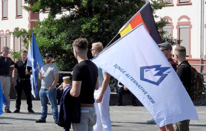 Mit dabei waren aber auch Leute, die vormals den „Flügel“ in NRW gebildet hatten. Das Zweckbündnis richtete sich gegen zwei andere Gruppen: einerseits gegen den weniger flexiblen Teil der „Gemäßigten“, andererseits gegen die jungen Radikalen, die, wie etwa der Bundestagsabgeordnete Matthias Helferich, im vorherigen Vorstand unter Rüdiger Lucassen enormen Einfluss hatten. Just jene jungen Radikalen störten Vincentz‘ Inszenierung beim diesjährigen Landesparteitag im Februar in Marl immens. Insbesondere die Junge Alternative (JA) — in der Partei bisher wahrgenommen als Chance zu einer optischen Verjüngung der AfD, als fleißiges Personalreservoir in Wahlkämpfen und bei der Vorbereitung von Veranstaltungen — ist mehr und mehr zur Belastung geworden. Geschuldet ist das vor allem ihrer nicht zu übersehenden Nähe zur IB oder extrem rechten Burschenschaften und nicht zuletzt der Einstufung der JA als „gesichert extremistische Bestrebung“ durch das Bundesamt für Verfassungsschutz.